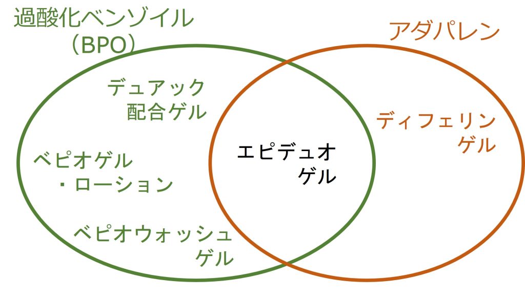 現在、毛穴のつまりを改善する塗り薬には、過酸化ベンゾイル(BPO)とアダパレンの2系列があります。